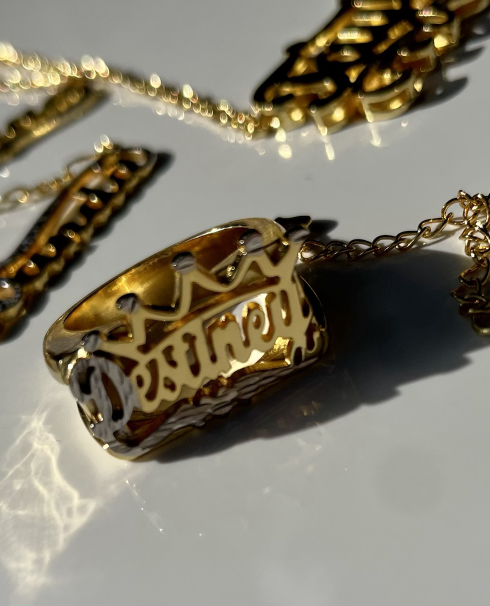 2 toned with a crown to enhace the custom name ring . Finished with small detailing